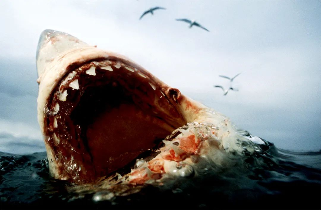 还有什么照片的视点能像《平视大白鲨》这张照片这么震撼,我真想不出来。史蒂芬·夫林克(Stephen Frink)把照相机置于水平面,凶悍的大白鲨正冲出水面。