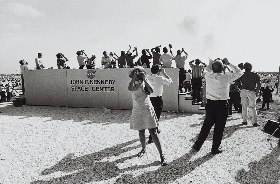 盖里· 维诺格兰德(Garry Winogrand)是街头摄影大师。1969 年,阿波罗11 号火箭从佛罗里达州的肯尼迪角发射(上图),他见证了这一历史性事件。虽然身在现场,但与照片中的其他摄影师不同,他并不想拍摄火箭升空。他的照片,表现了他对人类行为的一贯关注。他注意到这位女士的镜头没有对向火箭发射的壮观场景,而是对着不知什么让她感兴趣的景象。这位女士不寻常的举动,可能也反映了盖里·维诺格兰德自己离经叛道的好奇心。