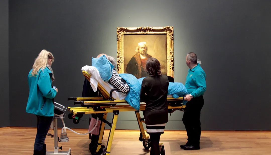 照片是一种速记方法。它不是小说、戏剧、电影,但令人惊叹的是,照片可以超越拍摄时的时间范围。一个特别有表现力的瞬间,暗含着过去和未来,并把细节留给了想象力。上图是我最喜欢的照片之一。观者很容易看出来这是博物馆的环境(碰巧这是阿姆斯特丹的荷兰国家博物馆),但是,观看这幅著名的伦勃朗绘画的人,为什么只有医护人员和一个躺在床上的人?你不需要知道完整的故事就能想到,把这名老妇人拉到这里肯定颇费周折,并且画面里的一切都会是有特别意义的。