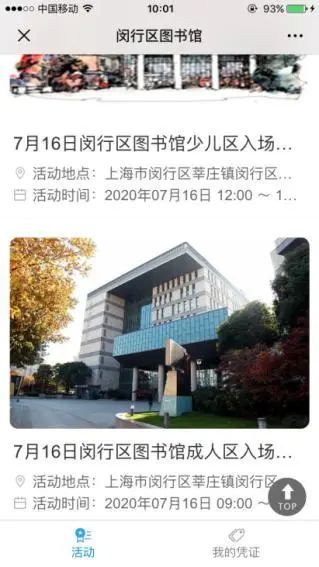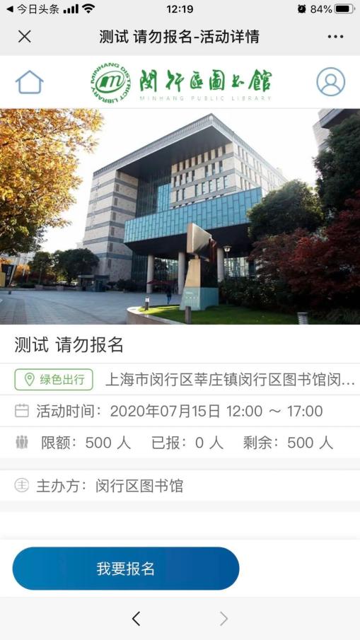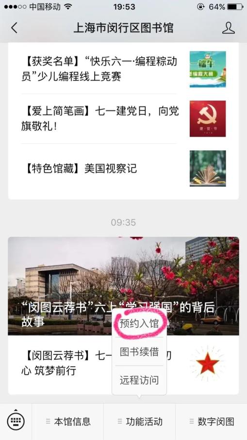 预约方式:关注闵行区图书馆微信公众号(微信号:mhlibrary)→点击下端自定义菜单“功能活动”栏目→点击预约入馆→选择成人区和少儿区→点击“我要报名”→保留预约成功截屏。