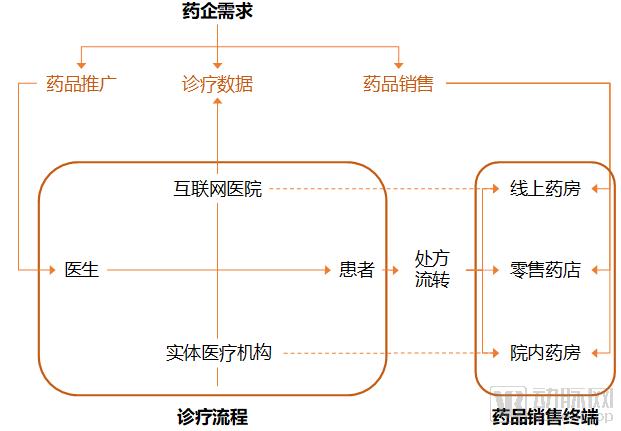 在传统诊疗环境下,药企对医院和药店的需求主要集中在三方面。首先是药品销售,主要通过医院的药房和零售药店;其次是药品推广,主要依靠当地的医药代表与医生之间的线下沟通实现;再次是数据采集,主要通过与医院合作,获取相关的患者随访数据。