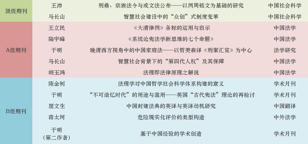 截至目前,团队在B1以上权威期刊共发表论文12篇,包括顶级期刊《中国社会科学》2篇,A级期刊《法学研究》《中国法学》共5篇,《中外法学》《学术月刊》《中国翻译》等B1期刊5篇。在《法学》《清华法学》《政法论坛》《现代法学》《法制与社会发展》等C1以上期刊发表论文57篇。