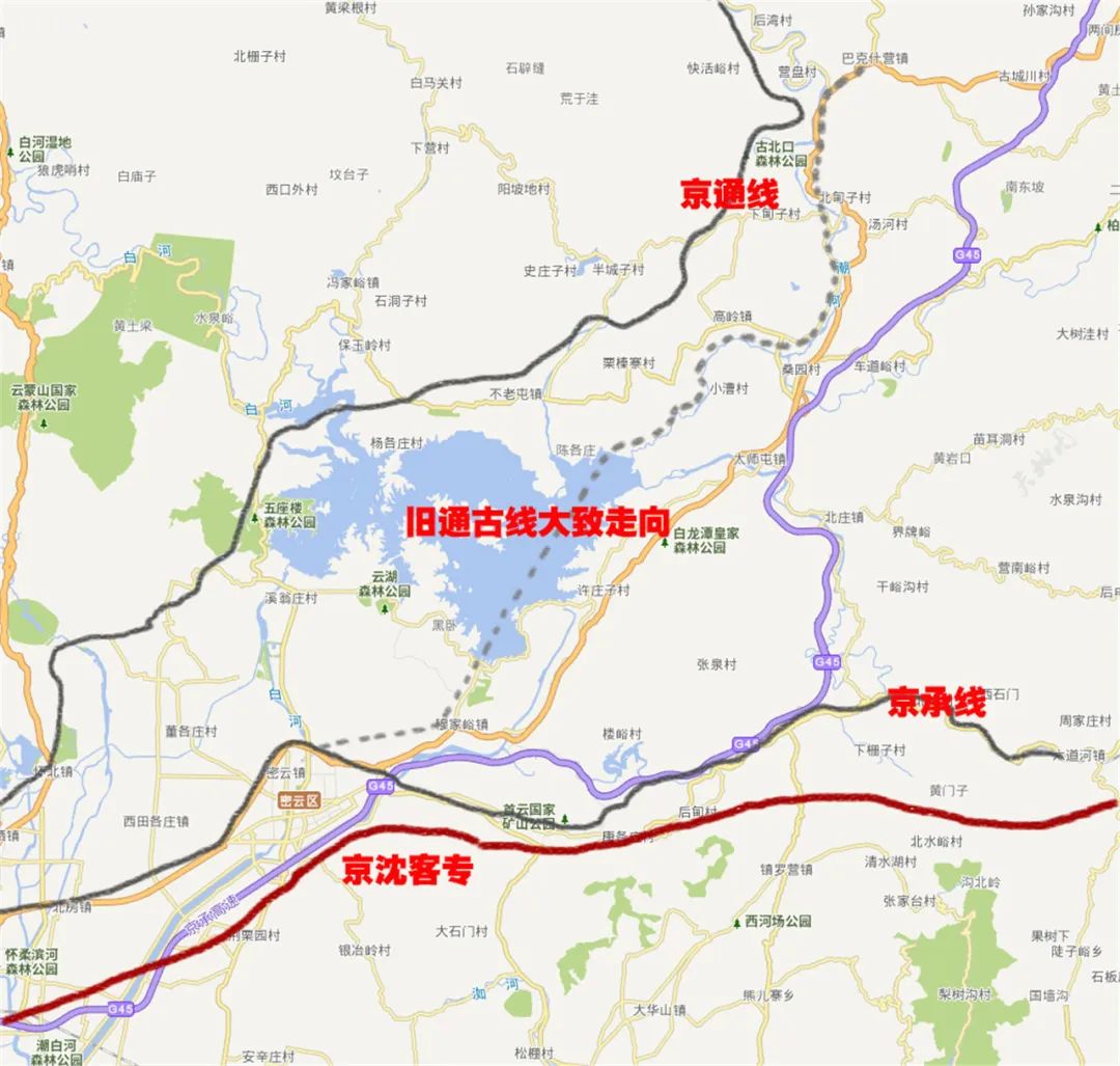 新中国成立后的1955年,开始修建京承线,1960年10月通车,全长256千米。这条铁路起自北京枢纽原东便门站(今北京站),基本沿袭通古铁路走向,经通州、顺义、怀柔到达密云。之后在穆家峪与通古铁路分道扬镳,一路向东,由墙子路出长城至六道河子,经过河北省兴隆县、鹰手营子矿区,至上板城与锦承铁路接轨。锦承铁路与京承铁路一起,构成京哈铁路之外,沈阳乃至东北进京的第二条铁路干线。