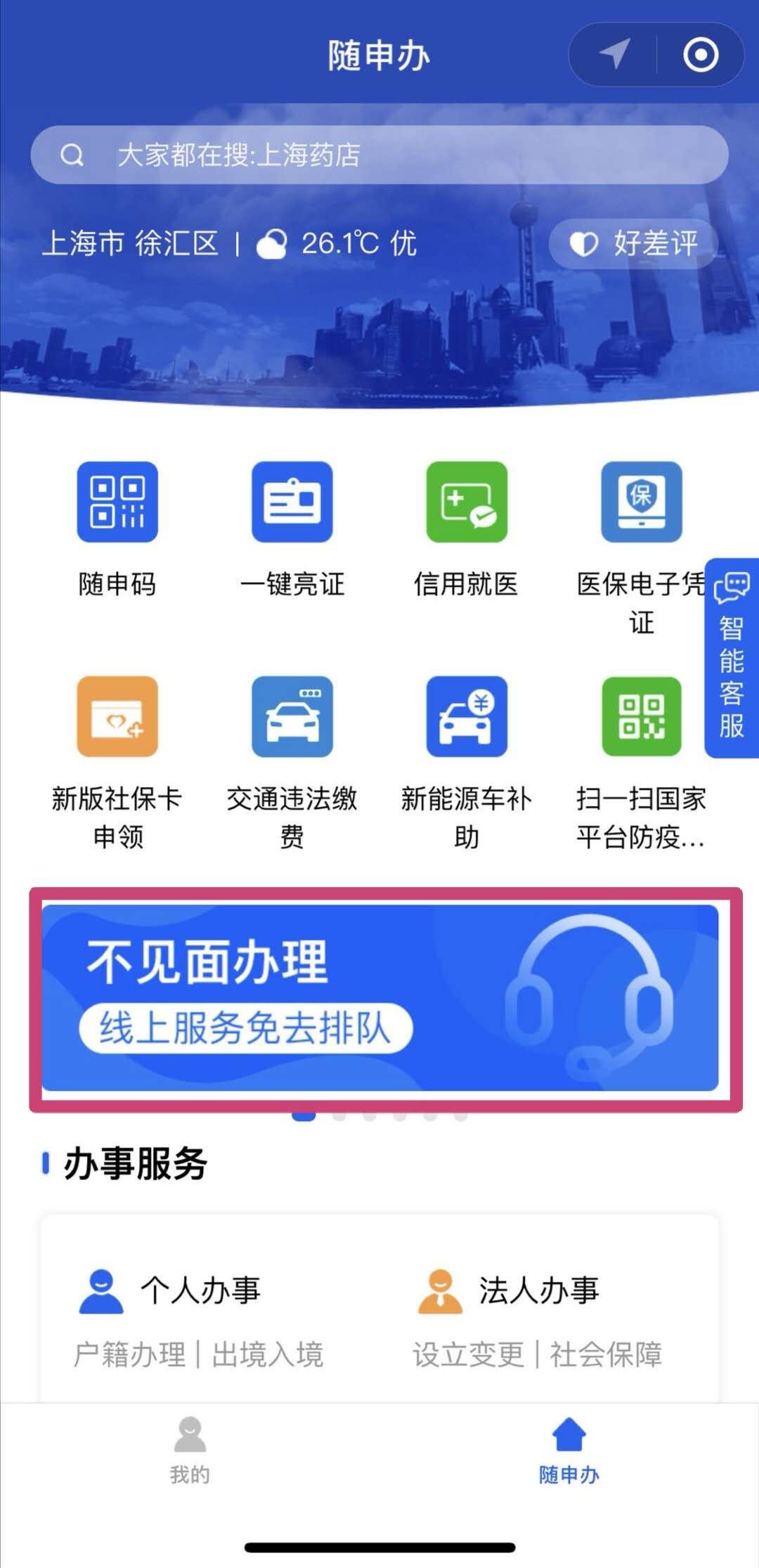第一步:实名登录“随申办”移动端各服务渠道,进入“不见面办理”专栏或在搜索栏内进行搜索,选择“外地零星结算大病、住院给付受理”服务事项进行办理。