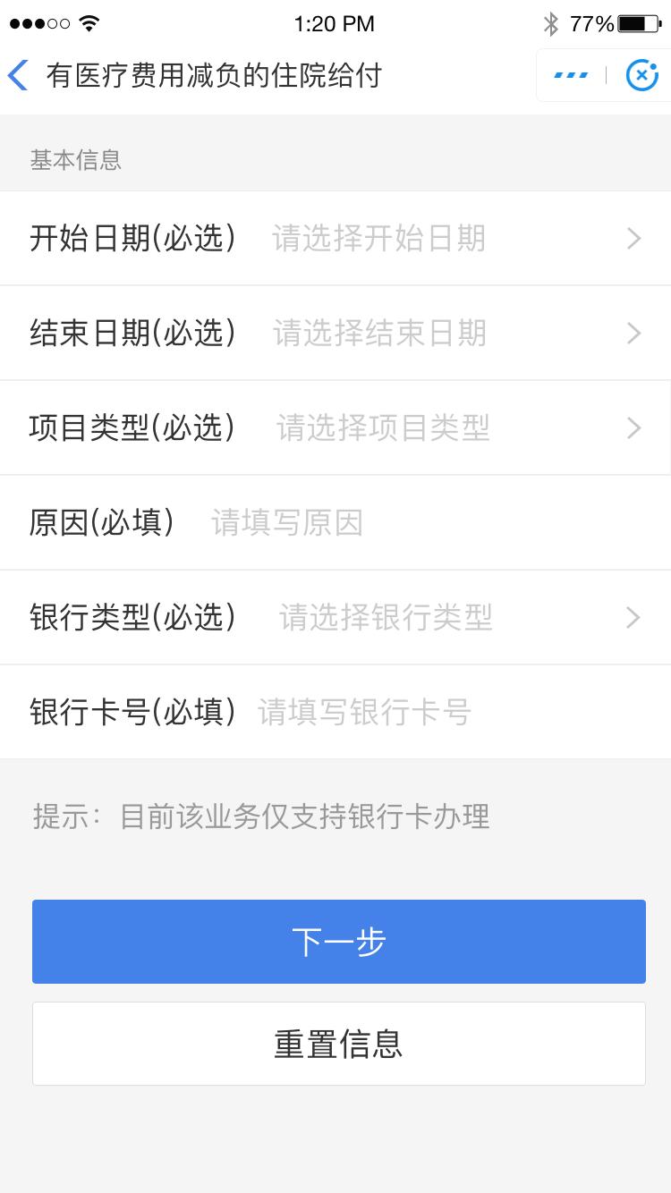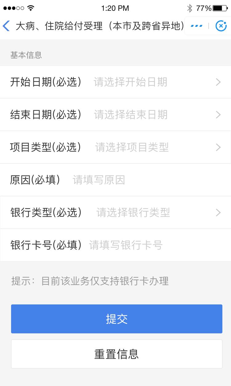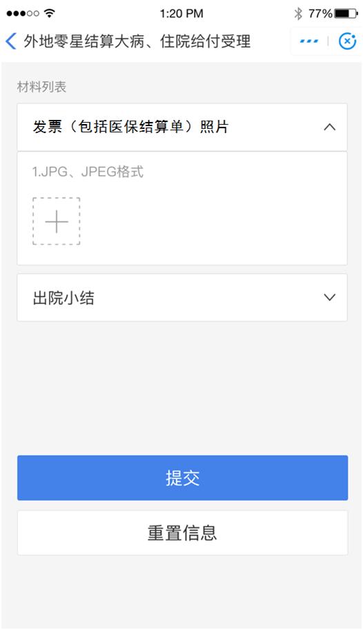 少数例外的四种情况(无本市养老金账号、外地零星医疗费收据、家庭病床的医疗费收据、医保减负的医疗费收据和精神病的医疗费收据)办理给付申请的,还需要上传相关资料。