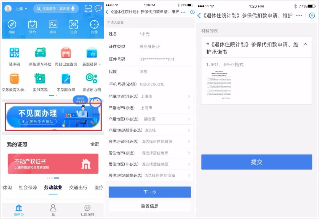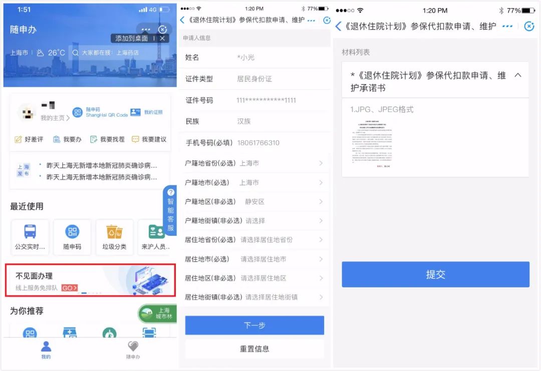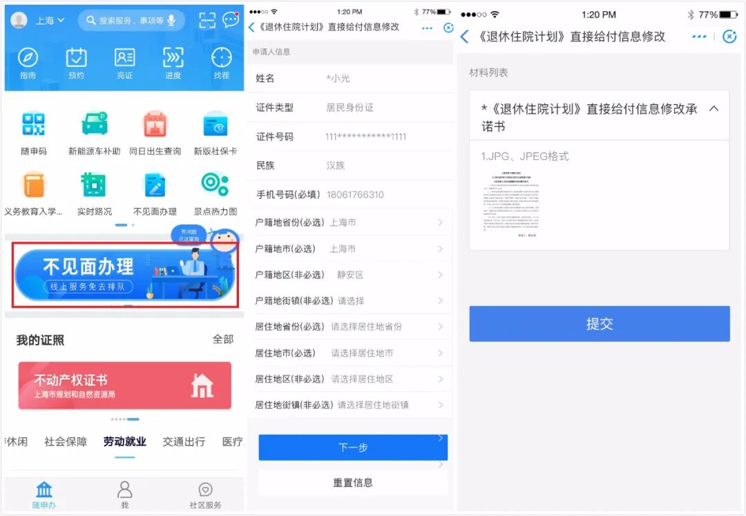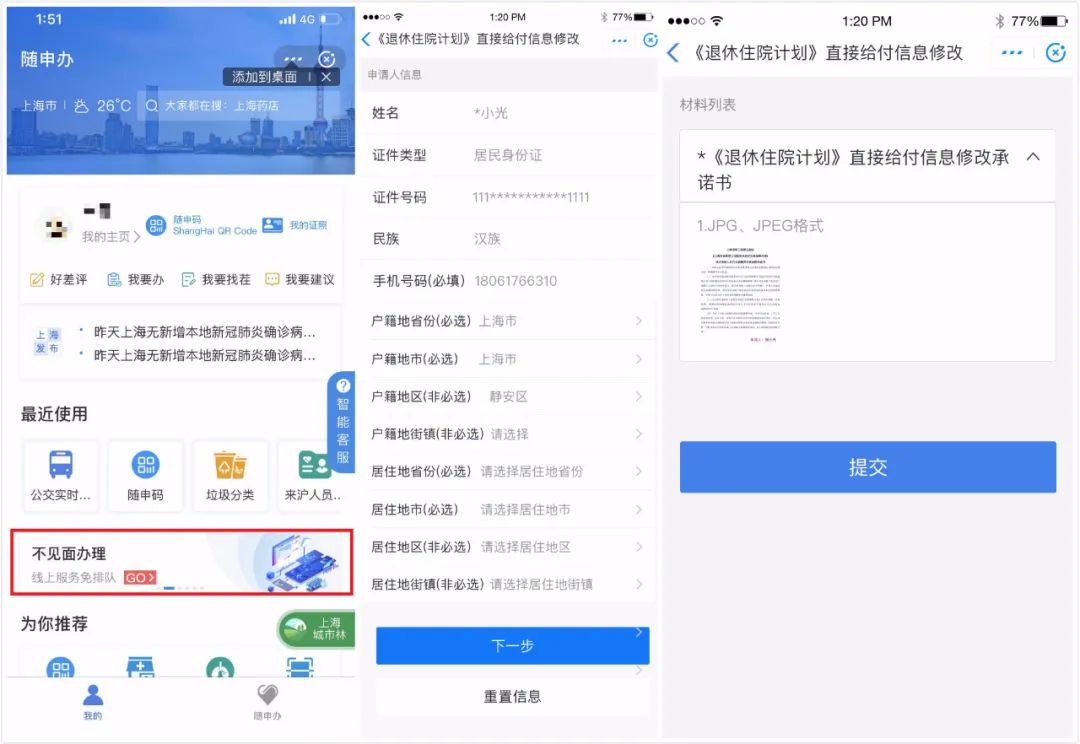 市大数据中心说,继“”实现 “不见面办理”后,“退休住院计划参保代扣款受理”和“退休住院计划给付受理”也实现 “不见面办理”。即日起,已完成参保的两类人员(社区退休人员,单位不组织参保但属于上海市职工基本医疗保险保障范围的本市退休职工)可通过微信“随申办”小程序、“随申办”APP以及“随申办”支付宝小程序三端的“不见面办理”专栏,“零材料”、“零跑动”办理“退休住院计划参保代扣款受理”和“退休住院计划给付受理”。详↓