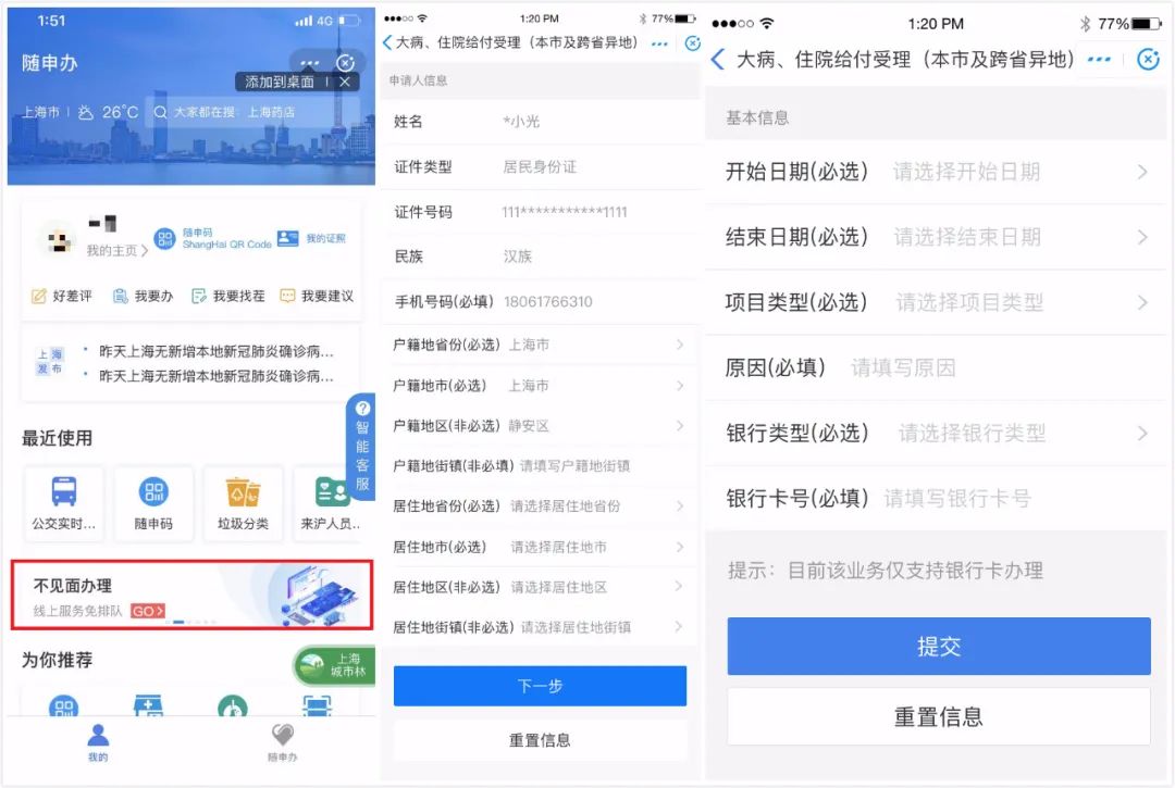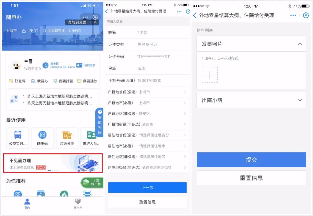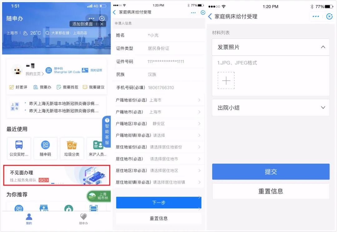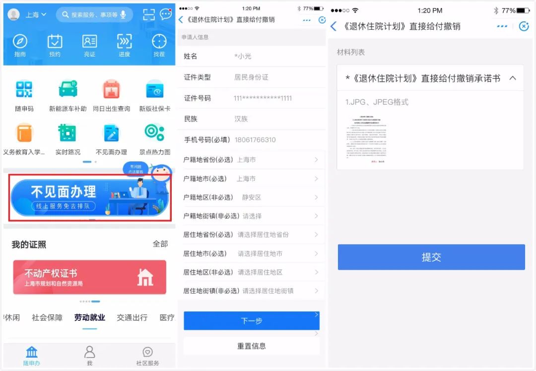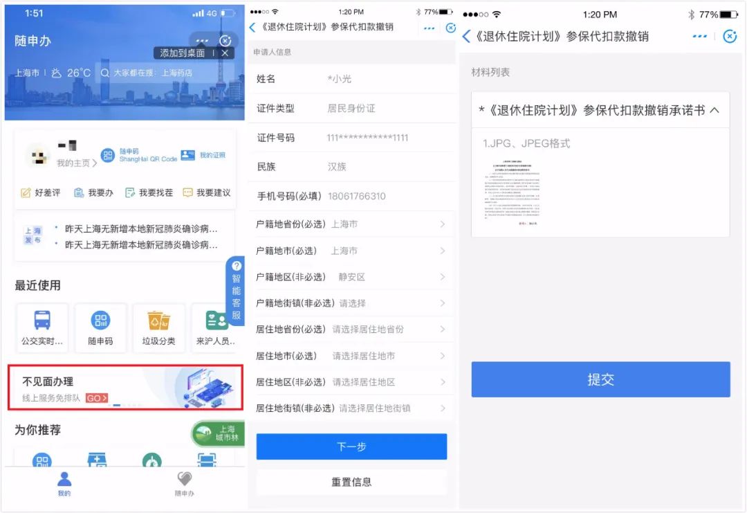 市大数据中心说,继“”实现 “不见面办理”后,“退休住院计划参保代扣款受理”和“退休住院计划给付受理”也实现 “不见面办理”。即日起,已完成参保的两类人员(社区退休人员,单位不组织参保但属于上海市职工基本医疗保险保障范围的本市退休职工)可通过微信“随申办”小程序、“随申办”APP以及“随申办”支付宝小程序三端的“不见面办理”专栏,“零材料”、“零跑动”办理“退休住院计划参保代扣款受理”和“退休住院计划给付受理”。详↓