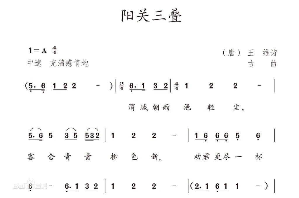 王维的这篇绝句是送友人去关外服役而作,被改为一首七弦琴歌,歌曲分三大段,即三次叠唱,每次叠唱在原诗前加一句作引句,原诗后又新增一段歌词,每段不相同,相当于副歌。因取诗中“阳关”一词,再加之歌曲的三次叠唱,故名《阳关三叠》,成为梨园乐工争相传唱的网红歌曲。