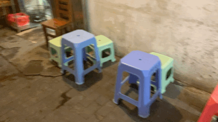 两排塑料凳依次摆开,一排高,一排低,高的那排用来放碗,低的那排坐人。