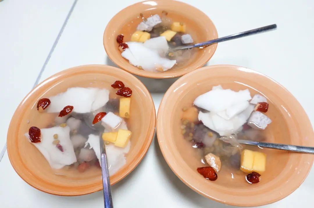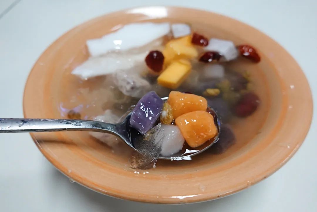 端上一碗椰子水清补凉,几颗剪碎的红枣漂浮在表面,银耳、芒果丁、蔓越莓、葡萄干、绿豆、花生等,与椰子水的甘甜滋味相伴相融。