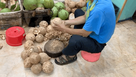 每天都有专人送来椰子,每个椰子都得从老林的手上过一遍,拍一拍、掂一掂,合格的才能被留下,可谓是“百里挑一”。