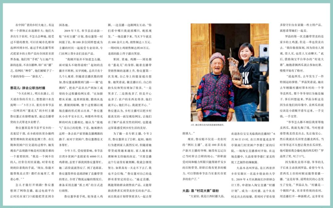 现在,鲁应聪不仅是一名农村的“网红主播”,还是 100 多名农户新兴主播的导师。她没有忘记自己当时辞去公职的初心,“辞职前受时间和精力所限只能帮助平安乡的百姓带货,辞职后我有更多的精力,可以帮助奉节县乃至重庆市更多的农户了。”