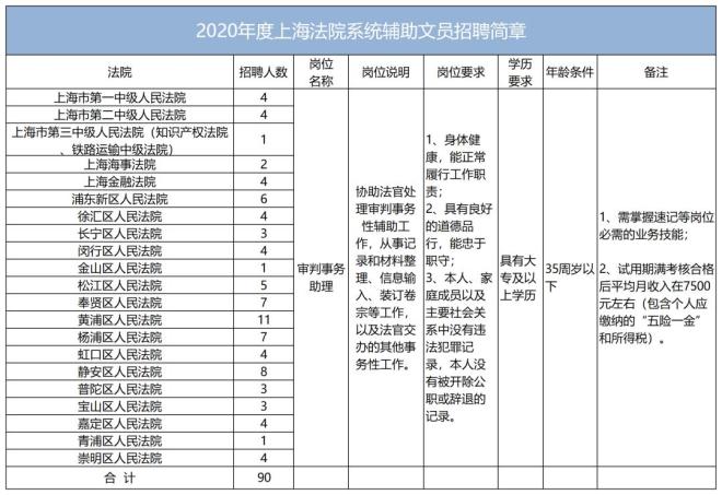 经市公务员局、市高级人民法院研究决定,面向社会公开招聘90名上海市法院系统辅助文员,现将有关事项公告如下: