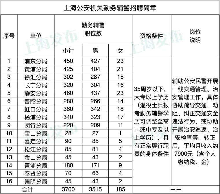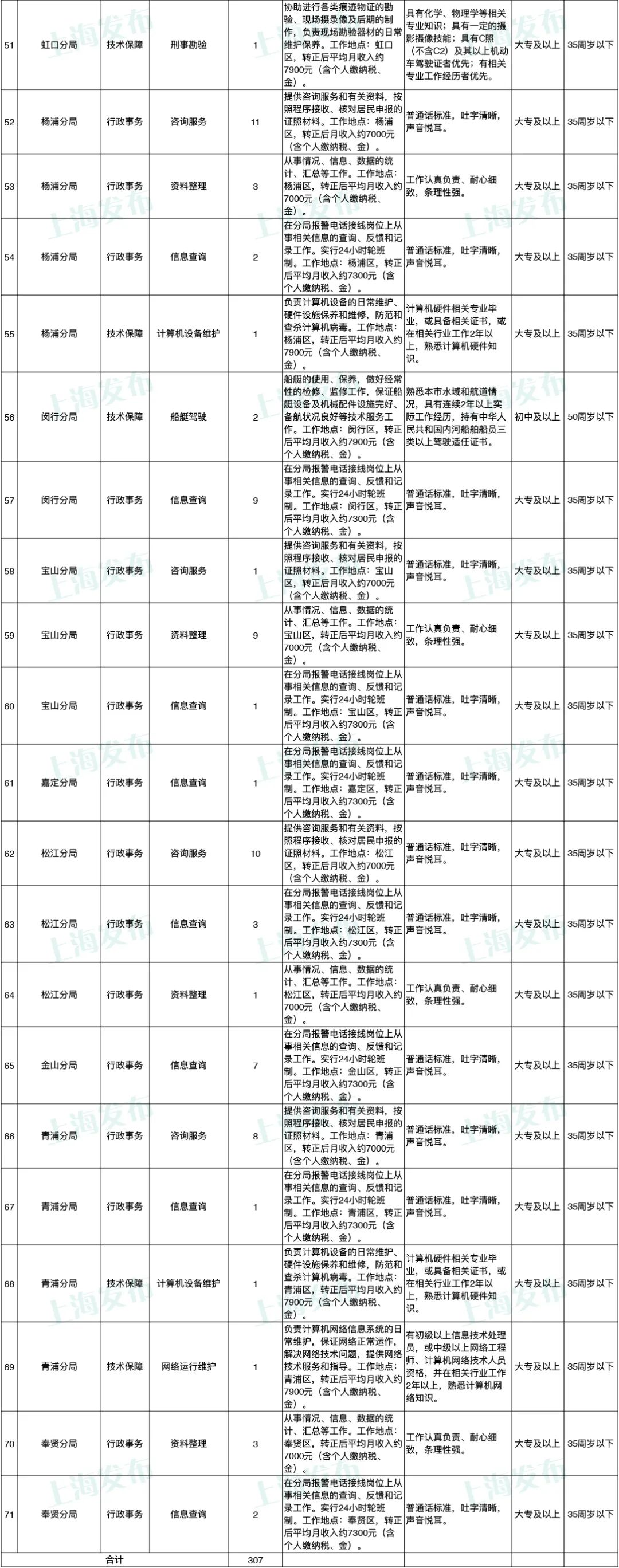 本次招聘3700名勤务辅警,主要在各地区公安分局协助公安民警从事交通管理、治安巡逻等辅助执法值勤工作;招聘307名文职辅警,主要负责协助非执法岗位人民警察从事行政事务、辅助管理、技术保障等工作。可通过"上海公安机关辅警招聘考试专题网站":http://www.shacs.gov.cn/Link/202007.htm(以下简称"招聘考试专题网站")进行查询。