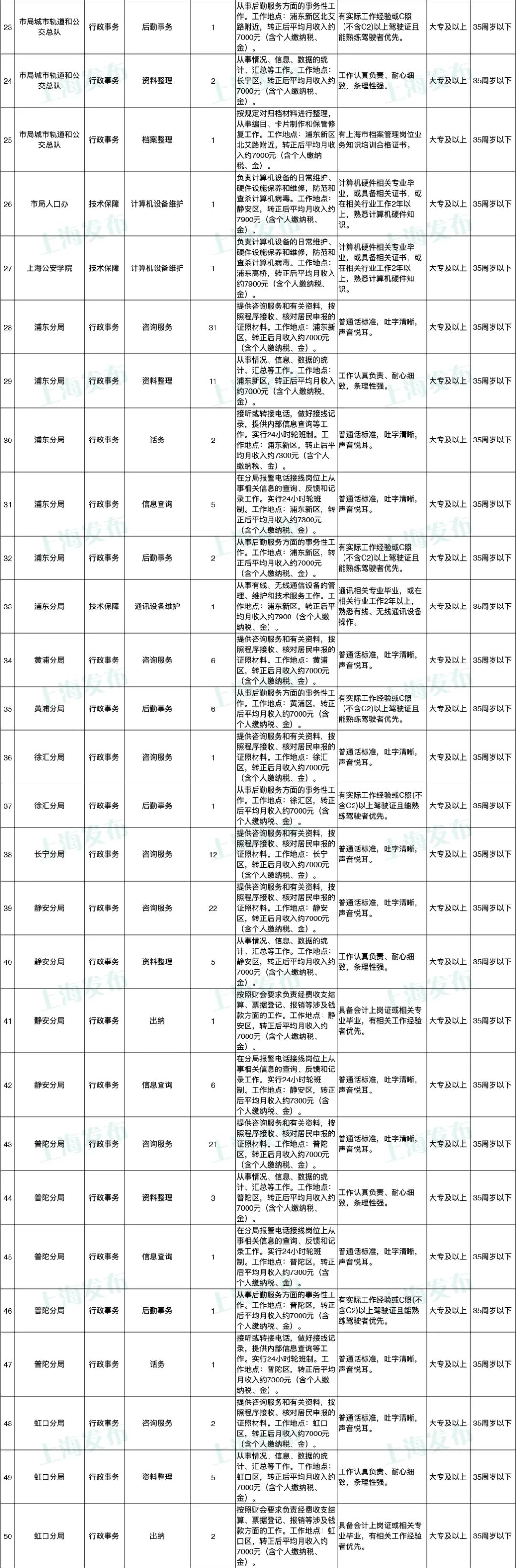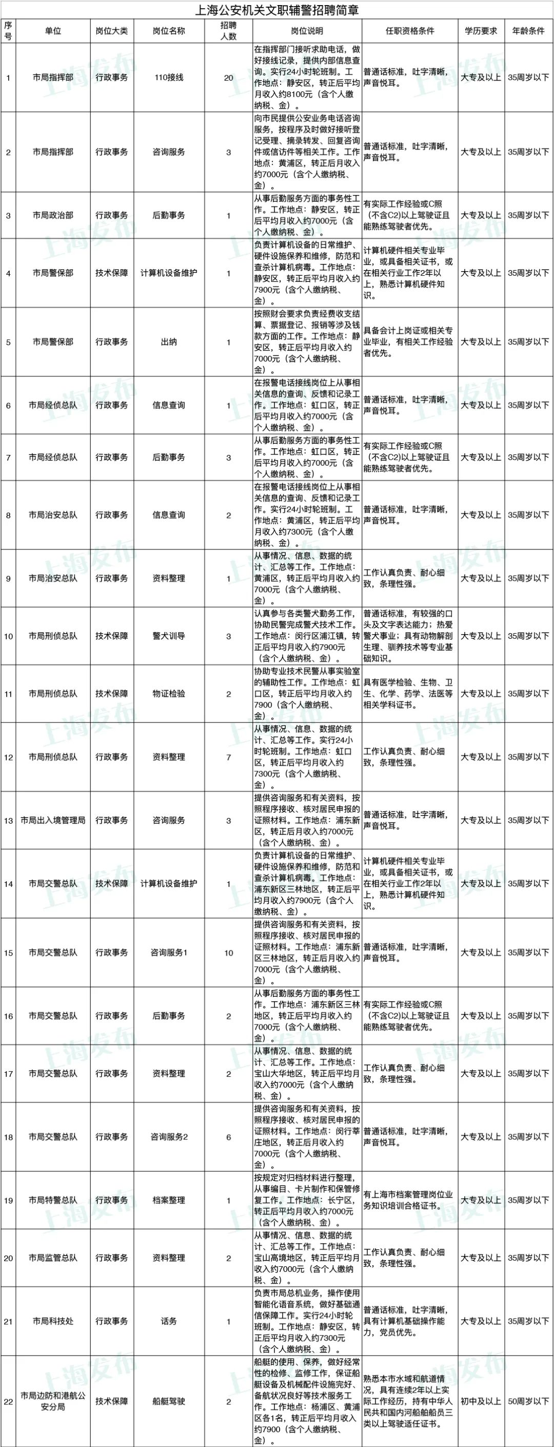市公安局将面向社会公开招聘公安辅警4007名。其中,勤务辅警3700名(包括女性185名)、文职辅警307名。具有上海市常住户口(高校集体户口除外)的社会人员及上海生源2020届普通高等院校毕业生均可报名。7月17日起可通专题网站(http://www.shacs.gov.cn/Link/202007.htm)进行查询。报名时间为:7月20日10:00至7月24日16:00。详见↓