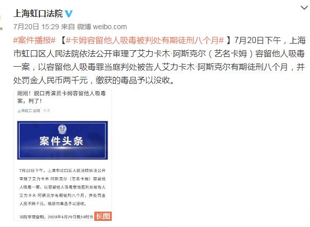 7月20日下午,上海市虹口区人民法院依法公开审理了艾力卡木·阿斯克尔(艺名卡姆)容留他人吸毒一案,以容留他人吸毒罪当庭判处被告人艾力卡木·阿斯克尔有期徒刑八个月,并处罚金人民币两千元,缴获的毒品予以没收。