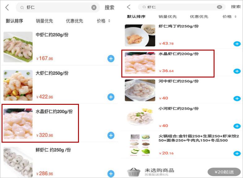 (两家店铺的虾仁从外观看并无太大差异,但价格相差十倍之多)