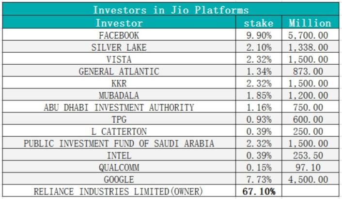 疫情期间的这几个月里, Jio 一共收到了来自 Facebook 、 Google 、高通、英特尔等巨头总共 200 亿美元的投资,合人民币大概1400 亿元。