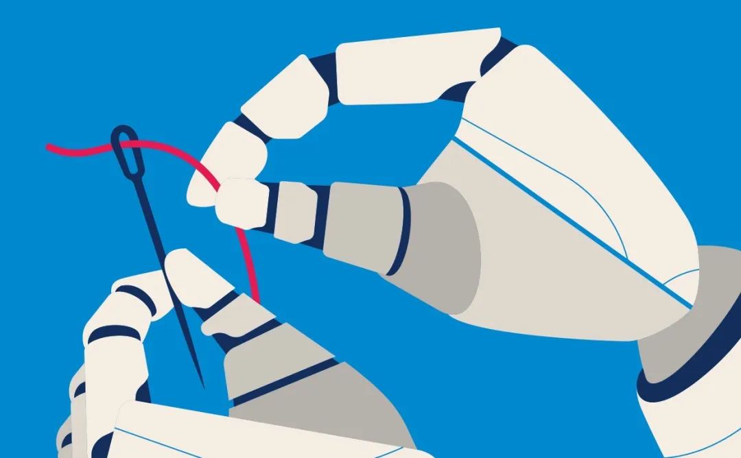 以往,工业机器人做缝制自动化的难点是服装面料太软或太滑,机器人很难平整地把面料抓起来再平放到缝纫机上;缝制大小不一的面料时,机器人也很难确定缝制轨迹;此外,工业机器人和缝纫机的运动速度不一样,前者持续运动,后者则是一走一停地缝纫,两种设备配合时容易出现拉扯布料的问题。