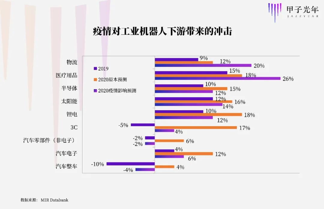 今年年初的新冠疫情又进一步加剧了行业困境。工业机器人的主要下游行业汽车零部件、整车装配、3C等都受到较大影响。
