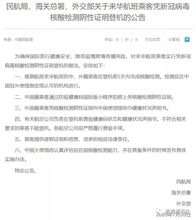 民航局、海关总署、外交部今天联合发文,为确保国际旅行健康安全,降低疫情跨境传播风险,对来华航班乘客实行凭新冠病毒核酸检测阴性证明登机的做法。