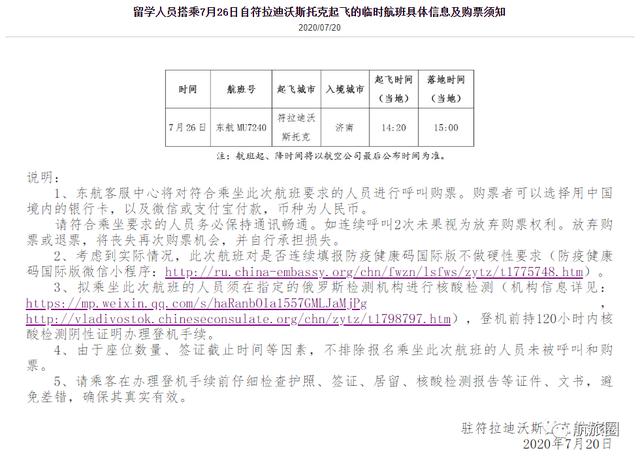 据中国驻符拉迪沃斯托克总领事馆,东方航空将于7月26日执行一班符拉迪沃斯托克-济南MU7240临时航班,临时航班计划于当地时间14:20起飞。