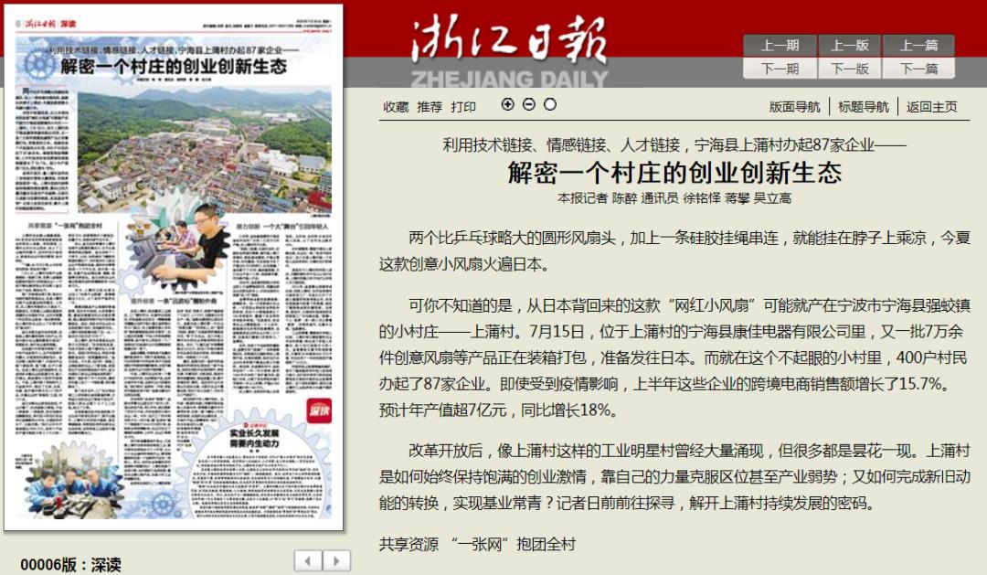 可你不知道的是,从日本背回来的这款“网红小风扇”可能就产在宁波市宁海县强蛟镇的小村庄——上蒲村。7月15日,位于上蒲村的宁海县康佳电器有限公司里,又一批7万余件创意风扇等产品正在装箱打包,准备发往日本。而就在这个不起眼的小村里,400户村民办起了87家企业。即使受到疫情影响,上半年这些企业的跨境电商销售额增长了15.7%。预计年产值超7亿元,同比增长18%。