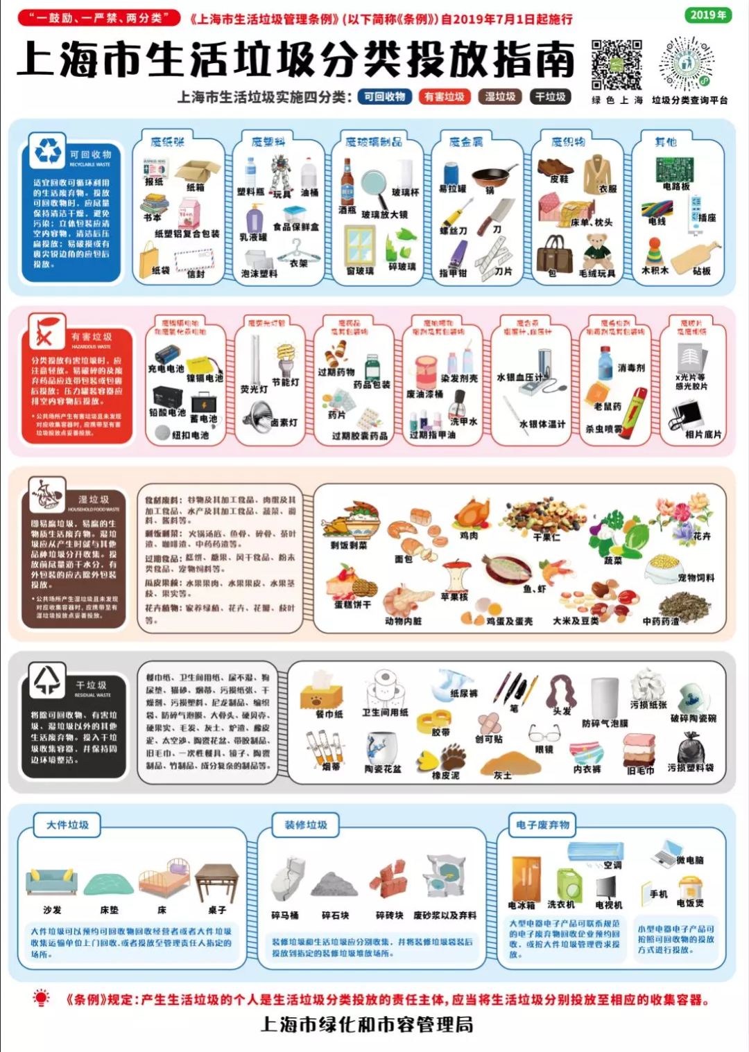 2019年,《上海市生活垃圾管理条例》颁布施行,全市1.3万余个居村分类达标率由2018年年底的15%提高到90%,单位分类达标率达到87%,135个街镇成功创建为“示范街镇”,10个区创建成为“示范区”,下发首批71个垃圾分类示范街镇专项补贴。可回收物回收量4049吨/日、环比增长431.8%,有害垃圾分出量0.6吨/日、环比增长504.1%,湿垃圾分出量7453吨/日、环比增长88.8%,干垃圾处置量17731吨/日、环比下降17.5%。完成2.1万余个分类投放点规范化改造,完成4万余只道路废物箱标识更新,配置及涂装237辆可回收物回收车、87辆有害垃圾车、1461辆湿垃圾车和3079辆干垃圾车,建成可回收物回收服务点1.5万个、中转站201个、集散场10个,餐厨废弃油脂收运、处置闭环管理落实到位。干垃圾焚烧和湿垃圾资源化利用总量从1.4万吨/日提高到2.1万吨/日,生活垃圾填埋比例从41.4%下降到20%。