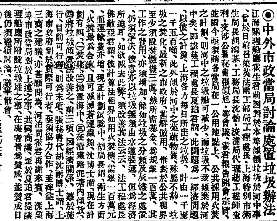 江海關理船應霍生君前因對於本埠傾倒垃圾於河中事丶曾於日前召集英法兩江部局工程處長·上海特別市衛生局長胡鴻基·工務局長沈怡·浚浦局代理總工程師查利·交涉公署秘書張似旭·等會議丶霍君報告開會宗旨丶並謂今亟須請各當局在一公用地點上丶公共採用火焚之計劃丶則河中之垃圾船可减少丶而垃圾不致傾棄於河中矣丶即據英工程處長夏珀君謂丶此問題爲一經濟問題丶以彼之計算丶上海各方每日所出之垃圾丶計由一千至一千五百噸丶此外傾於河中之菜蔬物質丶殊屬不尠丶垃圾之焚化丶最新之市政府丶甚鮮倣用丶惟對於公共租界至少須設焚燬機三處丶然所需基金丶爲規銀一百萬丶其工作之費用丶亦須增加丶餘如垃圾之分類及灰燼之處置丶仍須解决丶彼意亦以垃圾無須由水道裝運丶但爲經濟所迫耳丶如欲减去此弊丶須改善其法云云……