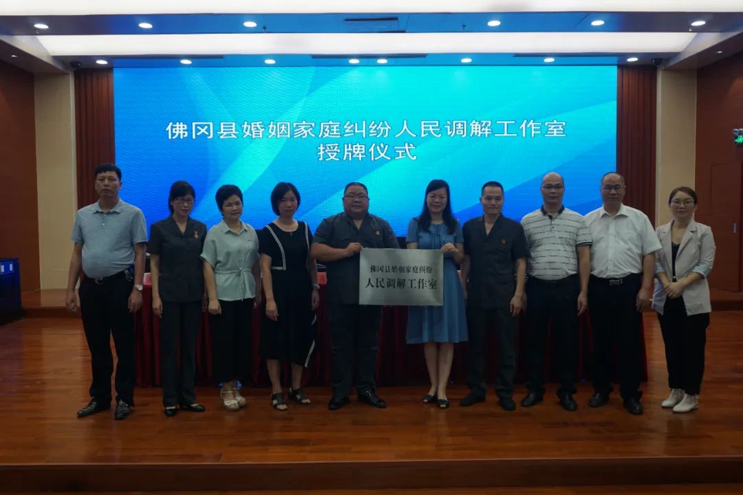 随后,县婚调委成员单位领导共同举行了“佛冈县婚姻家庭纠纷调解工作室”授牌仪式,并合影留念。