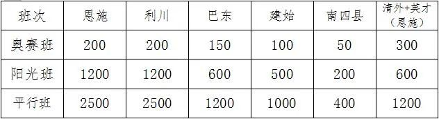 设置2个奥赛班,6个阳光班,7个平行班,根据中考成绩及在各县市的排名进奥赛班、阳光班和平行班,直接录取对应中考成绩县市名次见下表: