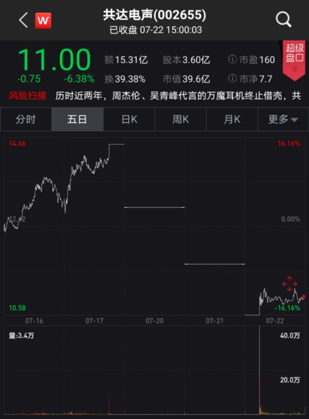 该股早盘一度跌停,随后打开跌停板,截至收盘大跌6.38%报11元/股,全天成交逾15亿,最新市值则不到40亿。至此,三个交易日内,共达电声跌幅达到24%,期间市值缩水10亿元以上。