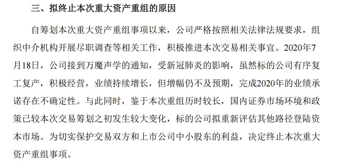 终止重组的理由有两个,“一是受疫情影响万魔声学完成2020年的业绩承诺存在不确定性,二是由于历时较长,相关政策变动较大,万魔声学拟通过其他路径登陆资本市场。”