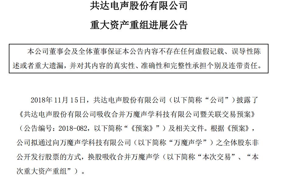 公开资料显示,今年3月,共达电声召开临时股东大会,审议通过了《关于继续推进本次重大资产重组事项的议案》。直到一个多月前日,共达电声还发布关于此次资产重组进展的公告。