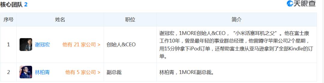 天眼查显示,万魔声学前身为加一联创电子科技有限公司,公司股创始人谢冠宏曾在富士康工作十年,担任事业群级总经理,离开富士康后开始做小米活塞耳机。目前公司主要产品包括有线耳机、蓝牙无线耳机、智能真无线耳机、智能音箱等。
