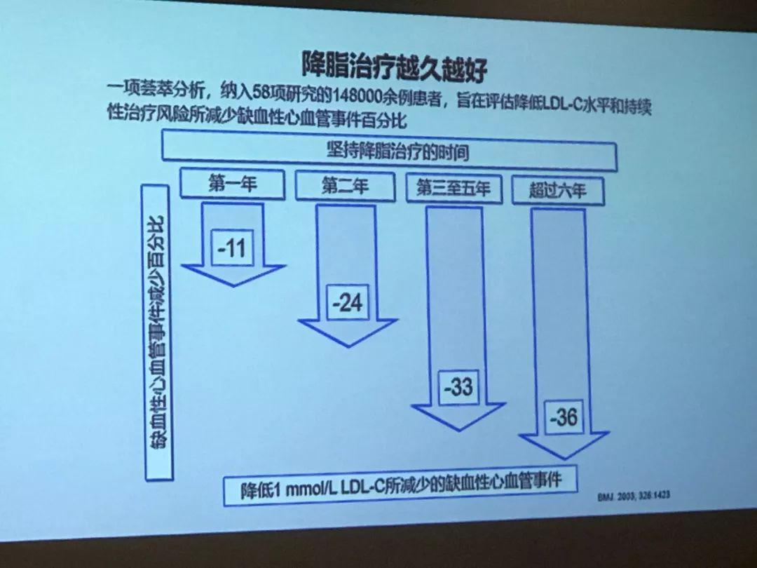 欧洲动脉粥样硬化学会“低密度脂蛋白致动脉粥样硬化性心血管病专家共识”指出,如果持续进行降胆固醇治疗,低密度脂蛋白胆固醇每降低1mmol/L,第1年内严重心脑血管疾病风险降低约10%,持续治疗2年后降低16%,3年后降低约20%,此后治疗每延长1年,发生心脑血管事件的风险进一步降低1.5%。治疗5年后其风险降低20-25%,治疗40年后其风险预计降低50-55%。
