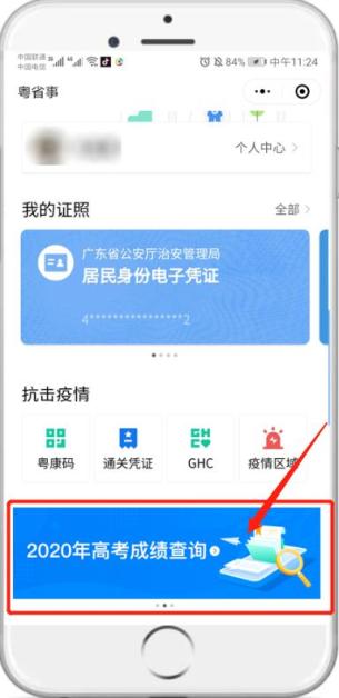 微信搜索登录“粤省事”小程序,从首页下图箭头所指位置进入“高考成绩查询”(高考成绩查询入口将于18:30后开放)。