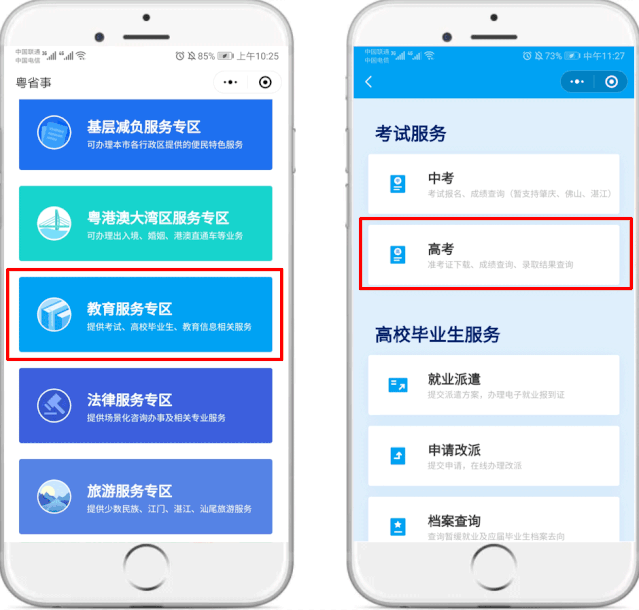 (1)微信小程序搜索进入:微信搜索“粤省事”小程序,进入小程序首页左上角切换所在城市,点击右上角放大镜图标搜索“高考”等关键词。