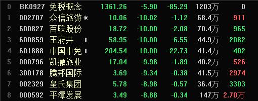 不过,相较于上述三位新人,此前大热的免税概念股今日集体走弱。东方财富显示,截至今日收盘,免税概念板块指数下滑5.9%,其中,众信旅游、百联股份、王府井、中国中免、凯撒旅业均跌停,腾邦国际、皇氏集团、平潭发展、西藏珠峰的跌幅均超8%。