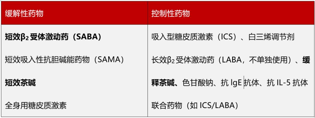 前者指需要长期使用的药物,主要用于治疗气道慢性炎症而使哮喘维持临床控制,亦称“抗炎药”。后者指按需使用的药物,通过迅速解除支气管痉挛从而缓解症状,亦称解痉平喘药[2]。