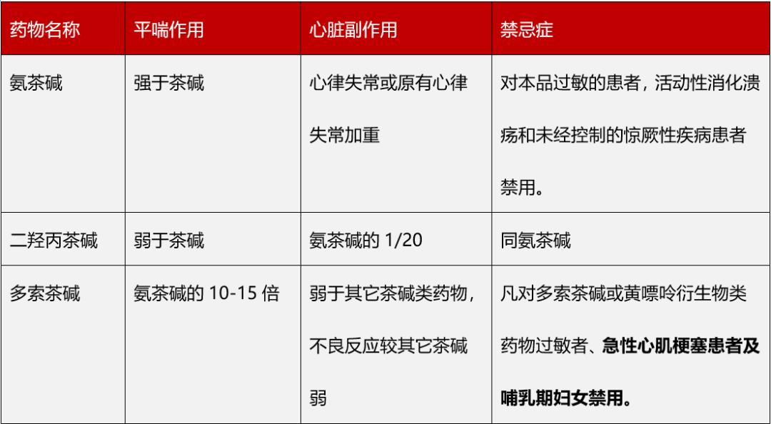 但总的来看,在一般治疗剂量的血浓度下,茶碱的其它多方面作用不很突出,多作为平喘药物使用,常见的有:茶碱、氨茶碱、多索茶碱、二羟丙茶碱。
