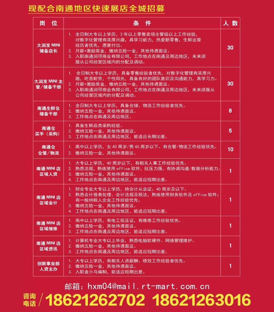 大润发相关人员向「电商在线」透露,大润发将继续快速拓店。事实上,从4月份开始,小润发就已经在盒小马公众号上公开招募储备店长、主管和买手等职位,光是储备店长就有30个名额。除了崇川区的第一家店,小润发还会在南通其他地方迅速拓展,包括周边的如皋、海门、泰兴等区域。