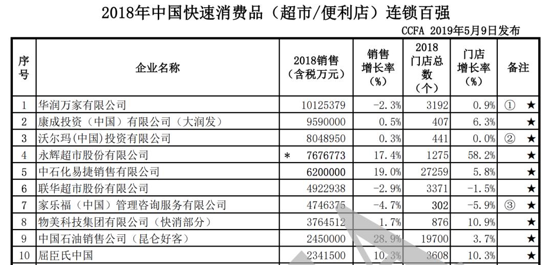仔细看这两年的百强榜,就会发现,去年第四名的永辉,取代了沃尔玛,和大润发的营收规模也在不断缩小,差距仅有15.5亿元。