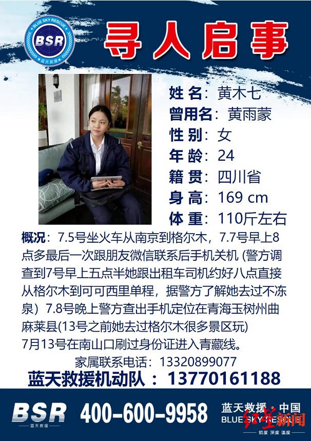 蔡队长介绍,蓝天救援队从黄雨蒙母亲及其姐姐处获悉,黄雨蒙是绵阳三台县人,今年24岁,在南京读大学,“很开朗的一个女孩。”因为毕业压力,黄雨蒙独自赴格尔木旅行。