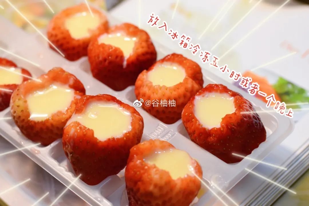 2、把炼乳挤进草莓里面,冷冻5小时或者一晚上,入口即溶,奶香浓郁。