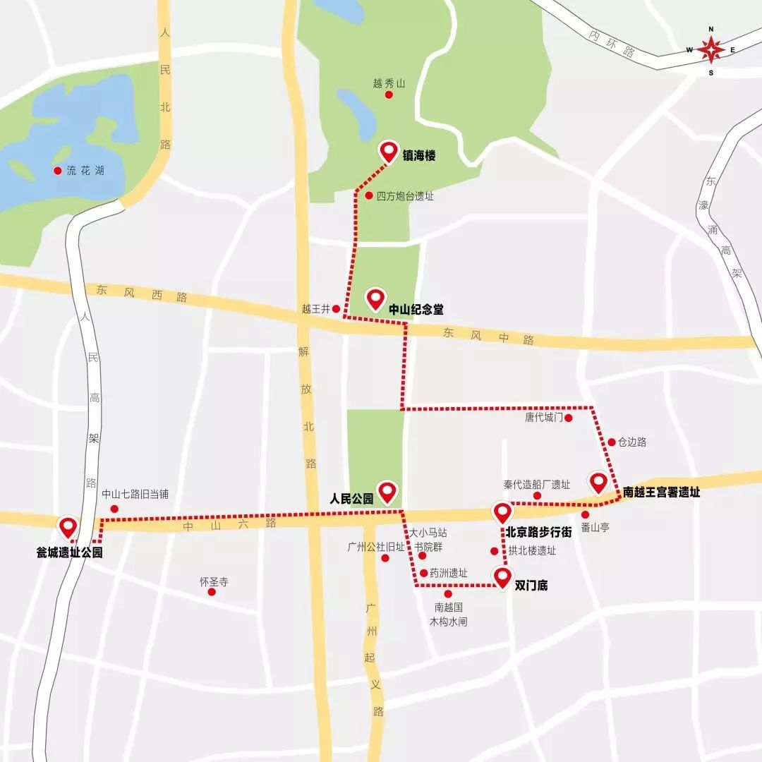 全长5公里的古都年轮线,串联镇海楼、越王井、南越王宫署遗址、北京路千年古道遗址、药洲遗址、瓮城遗址等15处古城遗迹,从越秀公园出发,至西门口终结,穿越多个朝代,展现两千多年的城市变迁。