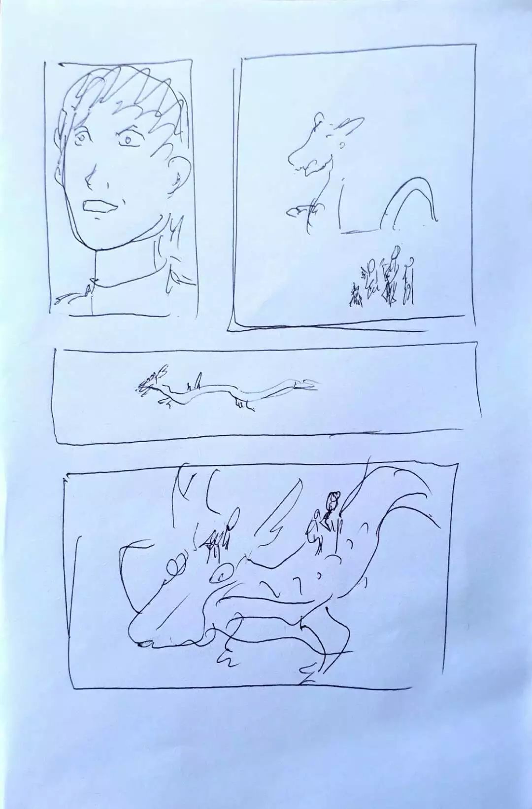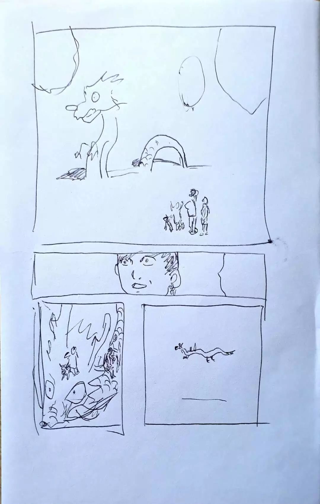 但这也绝非意味著他的漫画景框很呆板。比如漫画中,下册的第44页,示意图如下: