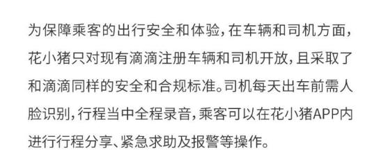 在花小猪的官宣公告里,对司机和乘客的准入门槛要求很高:为保障乘客出行安全和体验,在车辆和司机方面,花小猪只对现有滴滴注册车辆和司机开放,且采取了和滴滴同样的安全和合规标准。