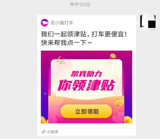 此外,花小猪在乘客端采用了社交裂变提升效率:乘客拉新即可获得奖励。比如,在一个个砍价群里,“帮我点一下”的花小猪用户,和“帮我砍一刀”的拼多多用户常常可以灵魂对线。