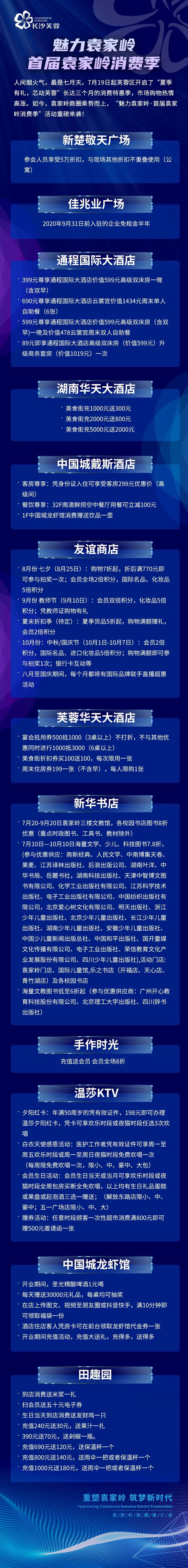作为重塑袁家岭的重磅环节,继2020芙蓉区“‘湘’约芙蓉 惠聚精彩”促消费活动启动之后,袁家岭商圈的各大企业、商家、楼盘就积极响应,分别从衣食住行各个方面推出了优惠券、减免、打折等促销活动。推出“魅力袁家岭 首届袁家岭消费季“发布“安居乐业”的楼宇优惠活动及商圈华天大酒店、通程国际酒店等高星级酒店,友谊商店、新华书店及温莎KTV等促销优惠政策,共计释放优惠上百万元。